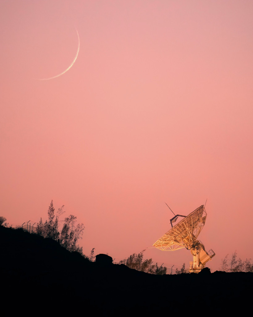 Une jeune lune croissante peut être difficile à voir. En effet, lorsque la Lune est dans sa phase croissante, elle ne peut jamais être loin du Soleil dans le ciel de la Terre. Et même si le ciel est encore clair, un mince croissant lunaire éclairé par le Soleil est clairement visible dans ce ciel en début de soirée. Cette photo a été prise au téléobjectif le 24 août, alors que la Lune était très proche de l'horizon ouest au coucher du soleil. Observée dans une phase de croissant étroit d'environ 1,5 jour, la partie visible éclairée par le soleil ne représente que 2 % de la surface de la face visible de la Lune. Au Centre spatial des îles Canaries, une antenne parabolique orientable permettant de communiquer avec les engins spatiaux est inclinée en direction de ces 2 % de la Lune. La couleur rose pastel du ciel au coucher du soleil est en partie due au sable fin et à la poussière du désert du Sahara soufflés par les vents dominants.