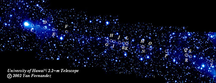 C'est alors qu'une équipe de l'Université d'Hawaii utilise le télescope de 2,2 m du Mauna Kea pour tirer l'affaire au clair. Ils découvrent le noyau cométaire à sa place... accompagné de 19 fragments, dont celui repéré par NEAT. Ces morceaux de la comète 57P sont gentiment alignés à intervalle irrégulier sur 0,5 degré de long (le diamètre apparent de la Pleine Lune), leur magnitude allant de 20 à 23,5.