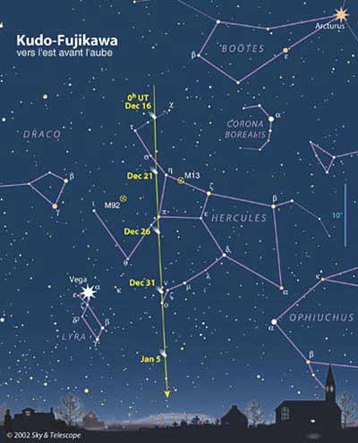 La comète est encore à plus de 50° d’élongation du Soleil, ce qui la rend assez facile à observer si vous bénéficiez d’un horizon dégagé, à 15° au-dessus de l’horizon le soir et à 30° le matin. La Nouvelle Lune se produit le 2 janvier 2003. Elle ne sera donc pas gênante au cours de cette période si vous observez le matin.