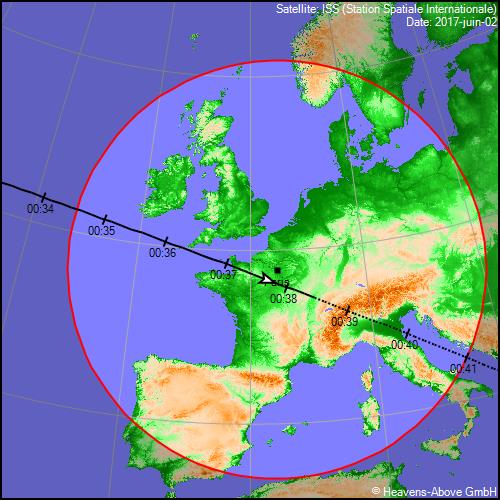 Si vous observez le passage du Dragon cette nuit, restez quelques instants de plus dehors, car l'ISS effectuera un superbe passage au-dessus de notre territoire entre 0h32 et 0h38. Arrivant du Nord-Ouest, la Station Spatiale passera directement au-dessus de la France sur une ligne Coutances (50) - Dijon (21). Ce passage sera bien visible depuis l'ensemble du territoire. Et même s'il s'agit d'un passage tout à fait ordinaire de l'ISS, il sera important symboliquement parlant : ne manquez en effet pas de saluer une dernière fois notre spationaute Thomas Pesquet, puisque ce passage de l'ISS sera le dernier visible où Thomas sera à bord ! Son retour à bord d'un vaisseau Soyouz est en effet prévu demain dans la journée. La fermeture de l'écoutille entre le Soyouz et l'ISS est prévue pour 9h35, heure de Paris. Le Soyouz se désamarrera ensuite de l'ISS à 12h47, allumera ses moteurs pour se désorbiter à 15h17, et atterrira enfin dans les plaines du Kazakhstan à 16h09, mettant un terme à un séjour de plus de six mois dans l'Espace d'un Français.