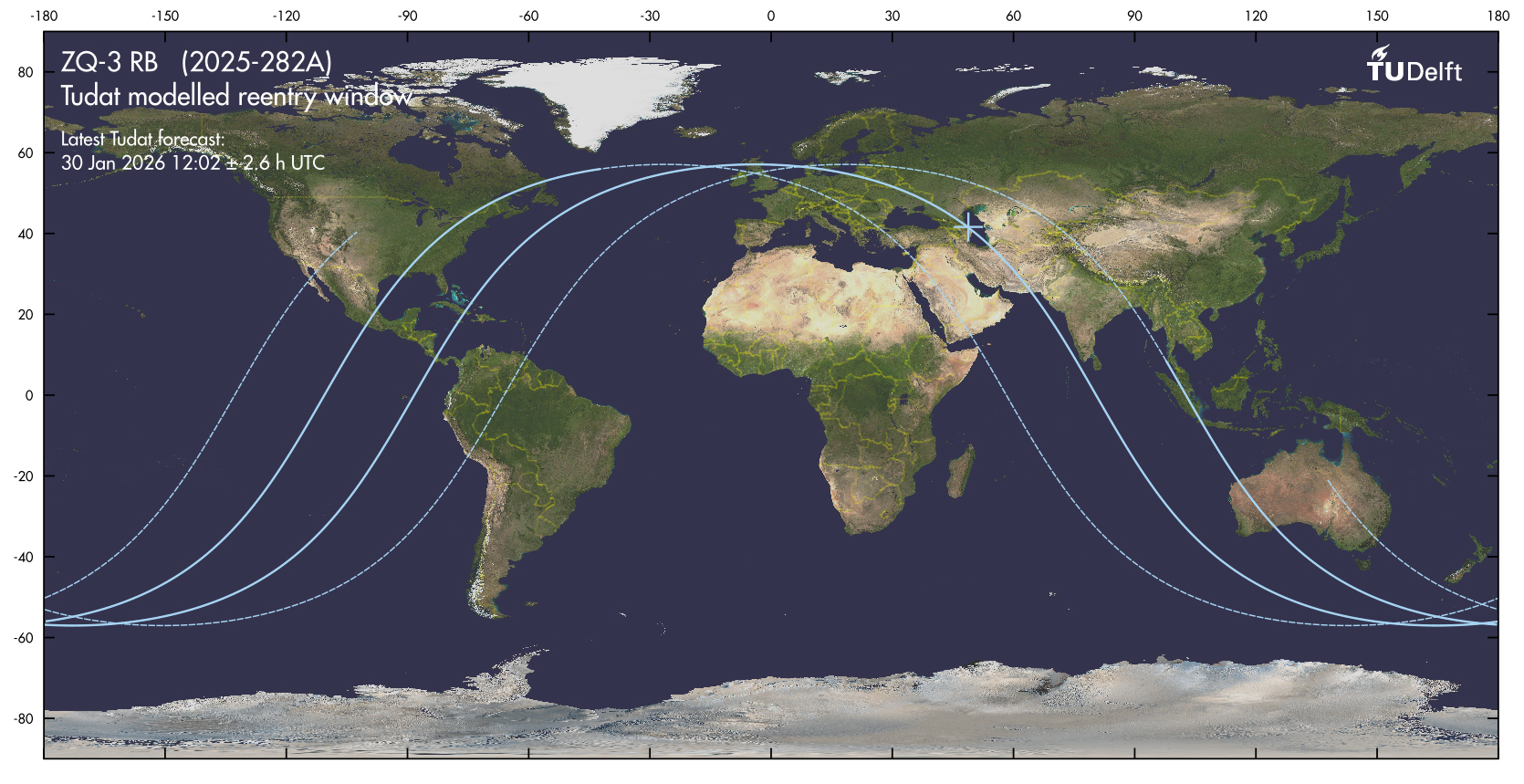 D'après les données de satellites de l'US Space Force observant dans l'infrarouge, Le 2e étage du lanceur Zhuque-3 s'est finalement désintégré au-dessus du Pacifique Sud à 13h39 heure française (01h39 le 31/01 heure locale, donc en pleine nuit), à plus de 1000 km au sud-est des côtes de Nouvelle Zélande. La prédiction de retombée de débris spatiaux est un art difficile...