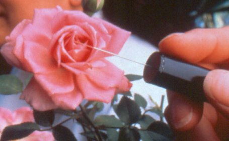 Pour recueillir le parfum, ils ont introduit dans Astroculture %u2122 une minuscule fibre de silicone avec laquelle ils ont touché la rose. Mesurant moins d'un centimètre de long , et d'un diamètre ne dépassant pas les deux millimètres , la fibre était enduite d'un liquide spécial auquel adhéraient les molécules présentes à la surface des pétales de fleur.