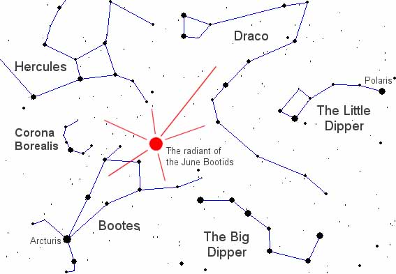 Bill Cooke vous donne ce conseil : « Sortez après le coucher du Soleil Vendredi et regardez juste au-dessus de vous. Vous devriez y apercevoir la constellation du Bouvier. » Si les Bootides de juin sont bien au rendez-vous, vous pourriez en apercevoir une ou deux par minute.