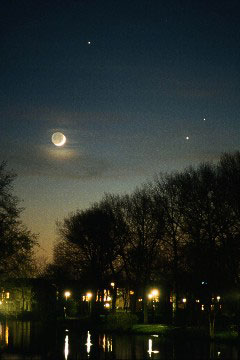 Ça commence ce soir, 22 mars 2004 (Carte), au coucher du Soleil. Pour bien profiter du spectacle, il vous faudra retenir un lieu d’observation offrant une vue bien dégagée vers l’Ouest. Avant que le ciel ne se soit complètement obscurci, tâchez déjà de repérer Mercure. C’est une " étoile " brillante que vous devriez discerner même à travers les derniers feux du Soleil. Pas sûr de l’avoir trouvée ? Prenez la Lune pour guide. Le 22 Mars, Mercure se trouvera directement sous le croissant lunaire. Immanquable !